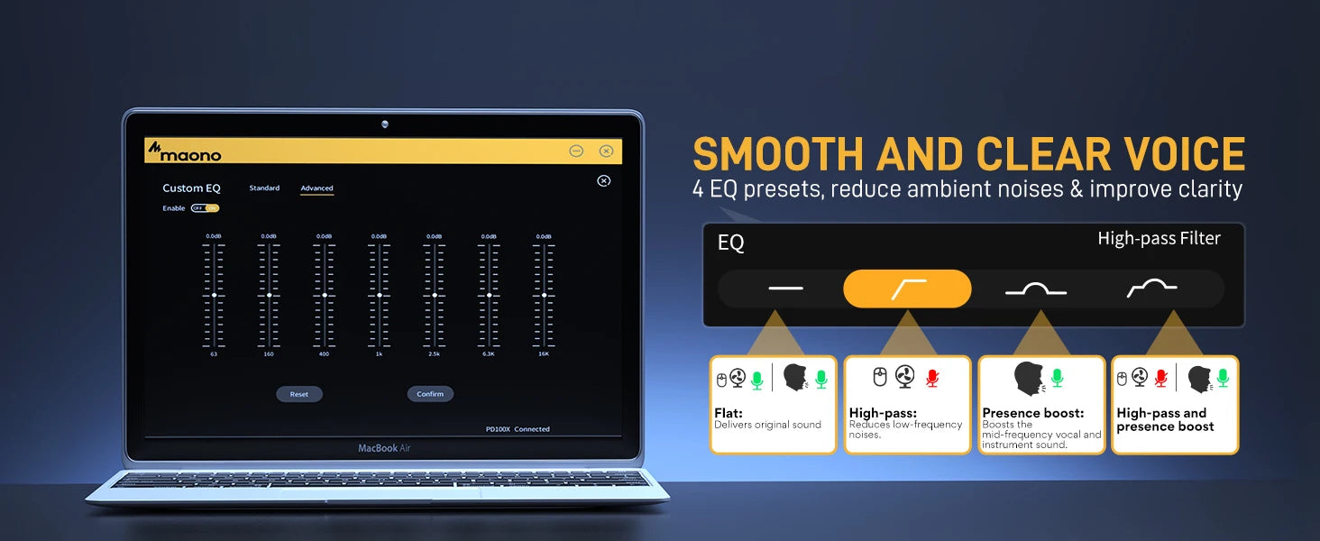 PD100X Microphone Features: Touch-mute button,Powered by Maono Link,Programmable RGB lights,Mic gain and headphone volume control,Compatible with PC, Smartphone and Game console,Cardioid polar pattern,Built-in windfoam